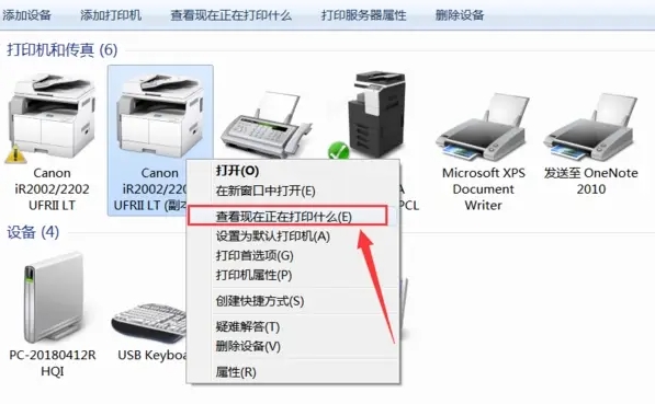 4、右鍵單擊正在打印的這臺(tái)打印機(jī),然后選擇“查看現(xiàn)在正在打印什么”。