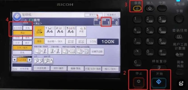 2、停止鍵:如果你想復印(打印)的文件設置錯了,且打印機已經(jīng)在打印了,可以按紅色“停止”按鍵。
